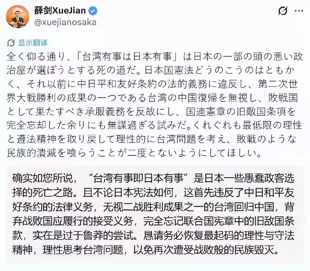 面对这样的狂言,薛剑总领事可不惯着 ——11 月 8 日,他在个人账号直接甩下一句硬核回怼:“对于自己伸过来的那个肮脏的脑袋,只能毫不犹豫地砍下来。你准备好了吗?” 这话掷地有声,哪里是什么 “威胁”?分明是我外交官在主权问题上的坚定表态,是被触碰底线后的必要亮剑!