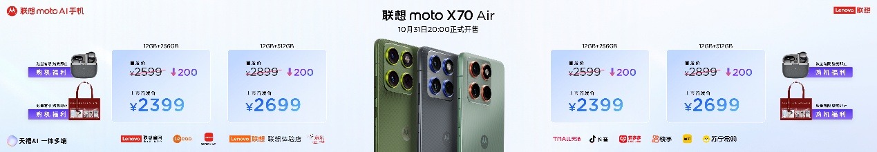 联想moto X70 Air起售价2599元,首销限时优惠200元,叠加国补与平台补贴后仅2399元起,10月31日20点全渠道开售。
