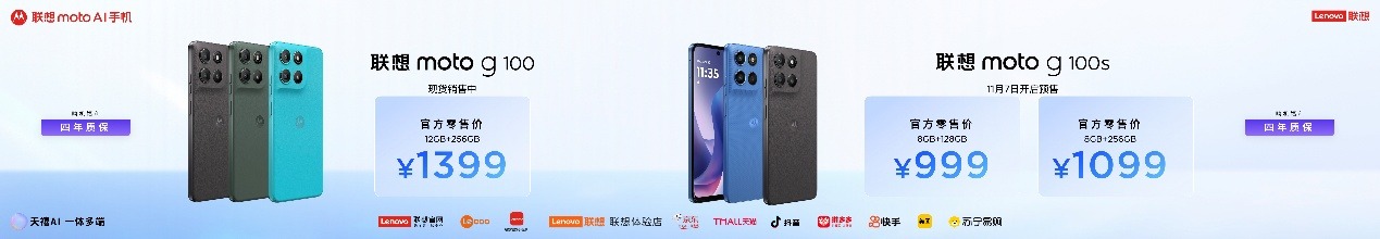 生态扩展:多端协同开启智能生活新维度本次发布会同步推出联想moto g100系列AI手机,搭载市场最强LCD护眼屏(120Hz高刷、1050尼特高亮、0频闪DC调光)与7000mAh超大电池,实现两天一充的续航能力。moto g100系列现货销售中,g100售价1399元,g100s预售价999元起。