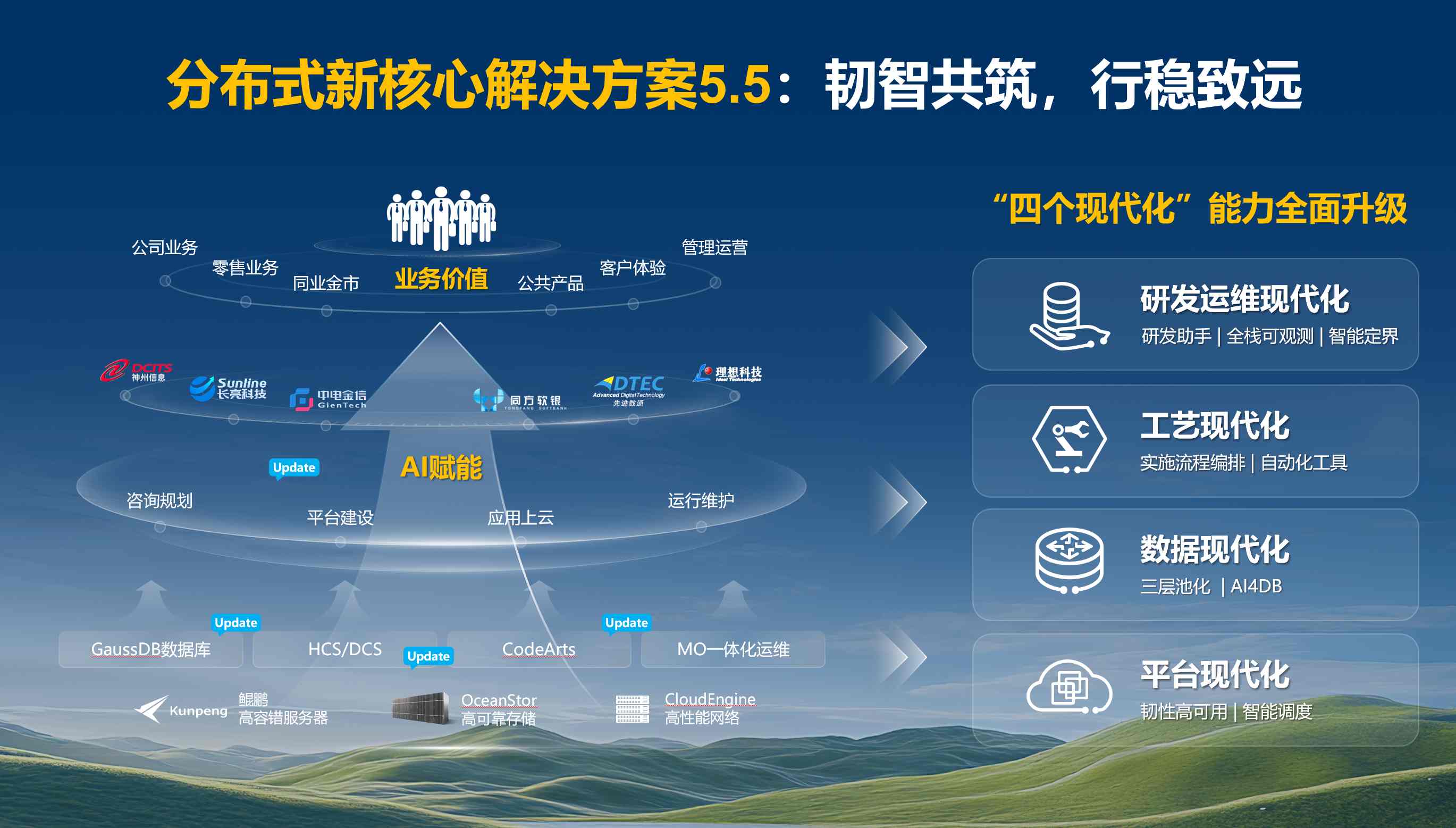 这背后,华为最新的分布式新核心解决方案5.5通过平台、数据、工艺、研发运维四个现代化+AI的全面升级,全旅程陪伴金融应用现代化,已开启银行核心系统升级从数字迈入智能的新阶段,以持续进化的分布式新核心重塑金融未来。