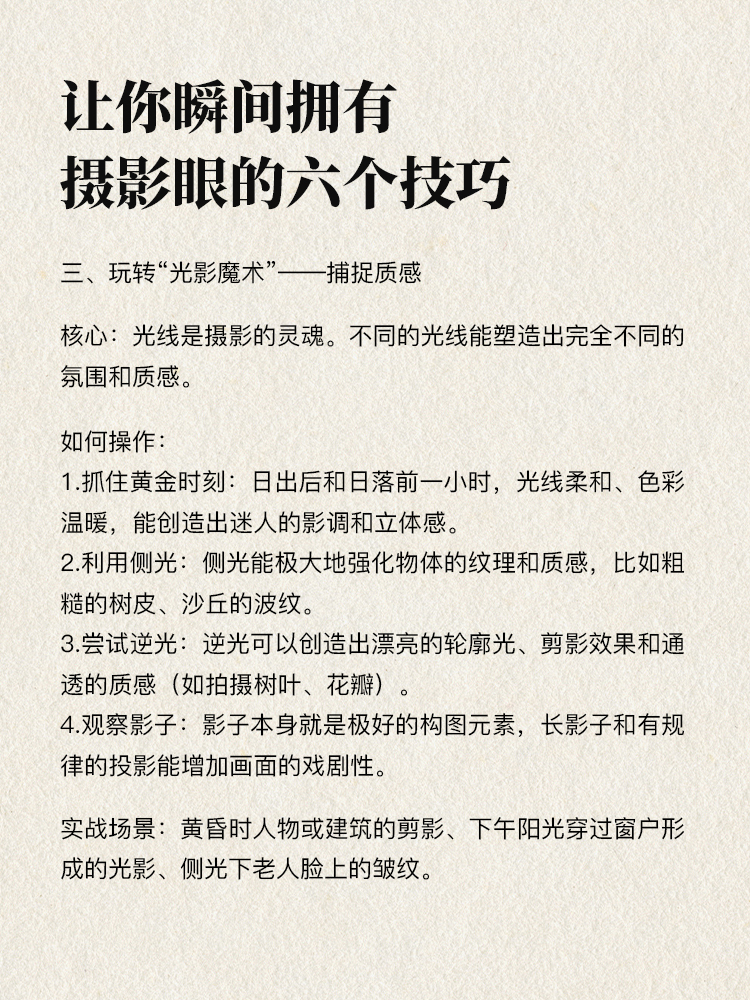 黄金光(晨/晚):拍人显白、拍景有暖调;