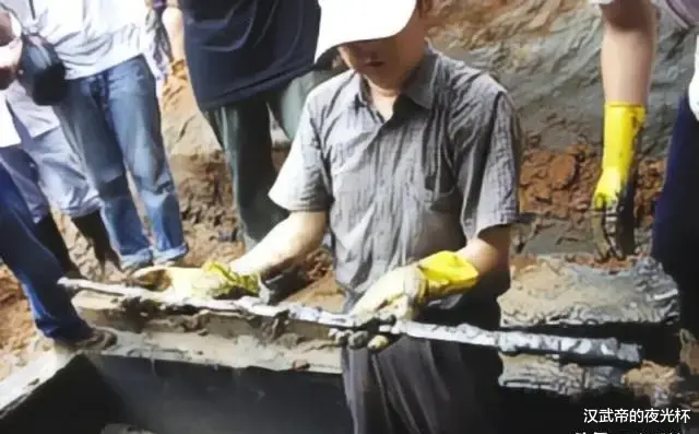正在附近作业的曹师傅等人闻声赶来,七八个人围着挖斗议论纷纷。有人伸手想去拨弄木板,突然 “咦” 了一声:“这是什么?” 众人顺着他指的方向看去,只见一块木板的缝隙里,赫然露出一截青黑色的金属物件,形状细长,带着岁月沉淀的光泽。曹师傅胆子大,小心翼翼地伸手捏住那物件往外一抽,一把长剑竟被他从腐朽的木板中拔了出来。