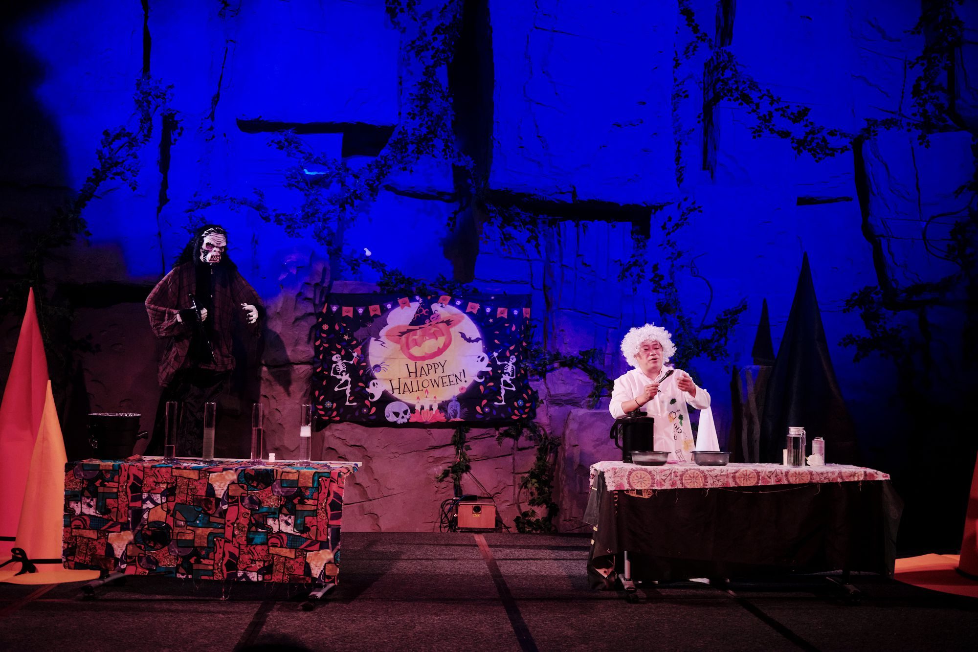万圣节主题的节目在这里轮番上演,深蓝色布景下,满头白发、穿着白大褂的“医学怪人”用不同材料制造出惊人的化学变化,让孩子们在尖叫中就学习到了科学知识。