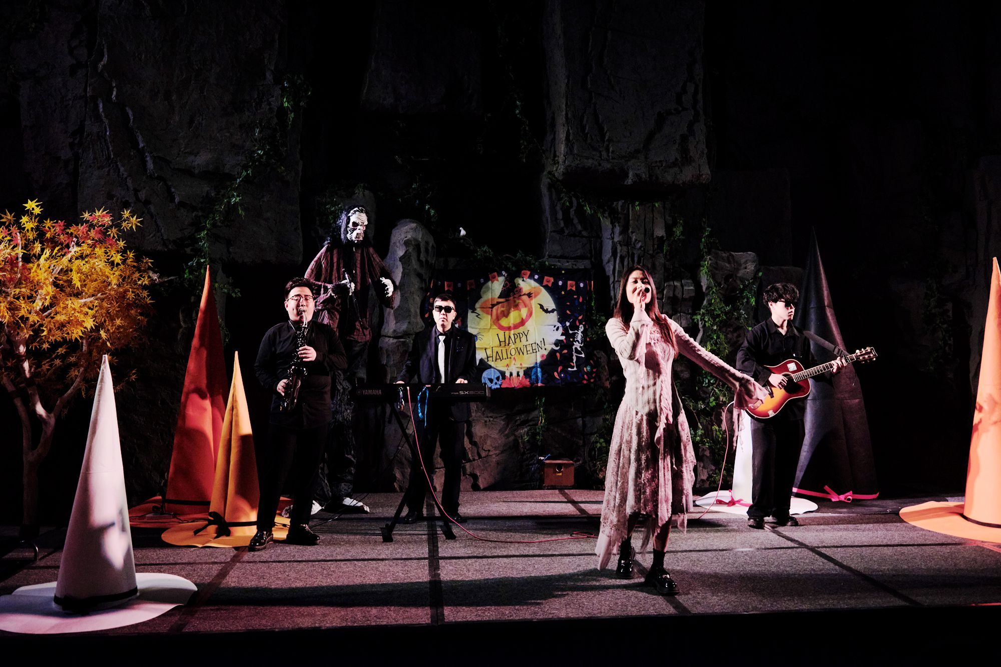 恐怖的骷髅作背景,乐队成员全部穿着酷酷的黑色西装,戴着酷酷的黑色墨镜,灯光诡异,主唱的声音遥远缥缈,仿佛来自另一个世界,让整个景区都笼罩在奇幻氛围中。