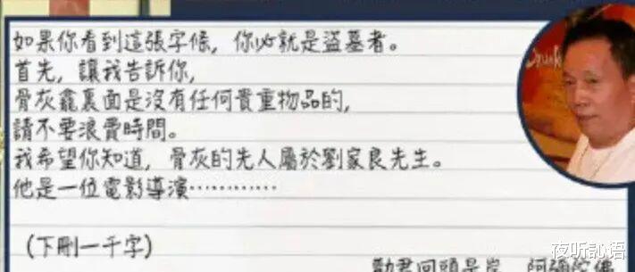 此外,翁静晶曾在刘家良墓里放过一张陪葬字条,而这张纸条就是写给盗墓者的。纸条上主要提示就是骨灰龛里没有贵重物品,骨灰的先人是一位电影导演。
