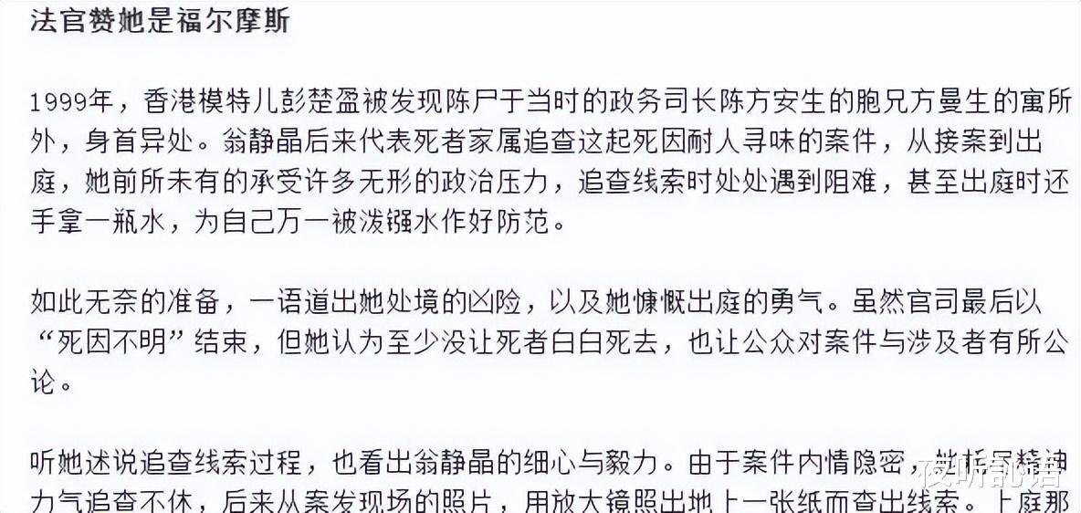 1999年,香港模特彭楚盈被发现死在当时香港政务司长陈方安生的胞兄方曼生的寓所外,身首异处。后来翁静晶代表死者家属追查这起凶案,承受了巨大的压力,追查时也遇到很多阻碍,但她没怕过,且慷慨出庭,赢得外界尊重。