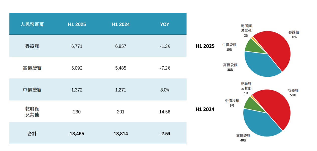 以行业龙头康师傅为例,其2025年上半年财报揭示了一个典型困境:方便面业务收益同比衰退2.5%,其中被寄予厚望的“高价袋面”销售额更是大幅下滑7.2%。怪异的是,在营收下降的同时,康师傅方便面业务的净利润却同比增长了11.9%。这勾勒出一个清晰的逻辑,企业通过产品升级、提价,实现了“以价补量”,用更少的销量换取了更多的利润。