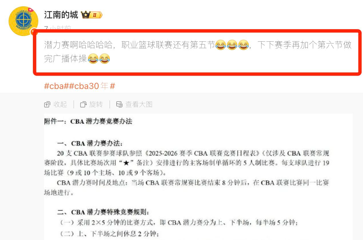 按照CBA最新规则的解释,第5节潜力赛将会在比赛结束也就是第四节比赛结束之后进行,上下半场各5分钟,一共10分钟,比赛都已经结束了还要再打10分钟这是为什么?是要给坐板凳的球员上去打一下吗?不然的话这就有点奇怪了。媒体人甚至愤怒的表示,应该增加第六节,集体做广播体操!