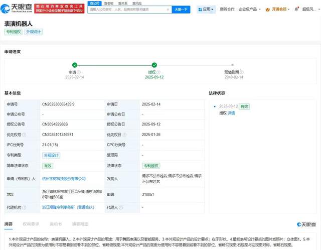 天眼查App显示,近日,杭州宇树科技股份有限公司申请的“表演机器人”外观专利获授权。摘要显示,本外观设计产品的名称为表演