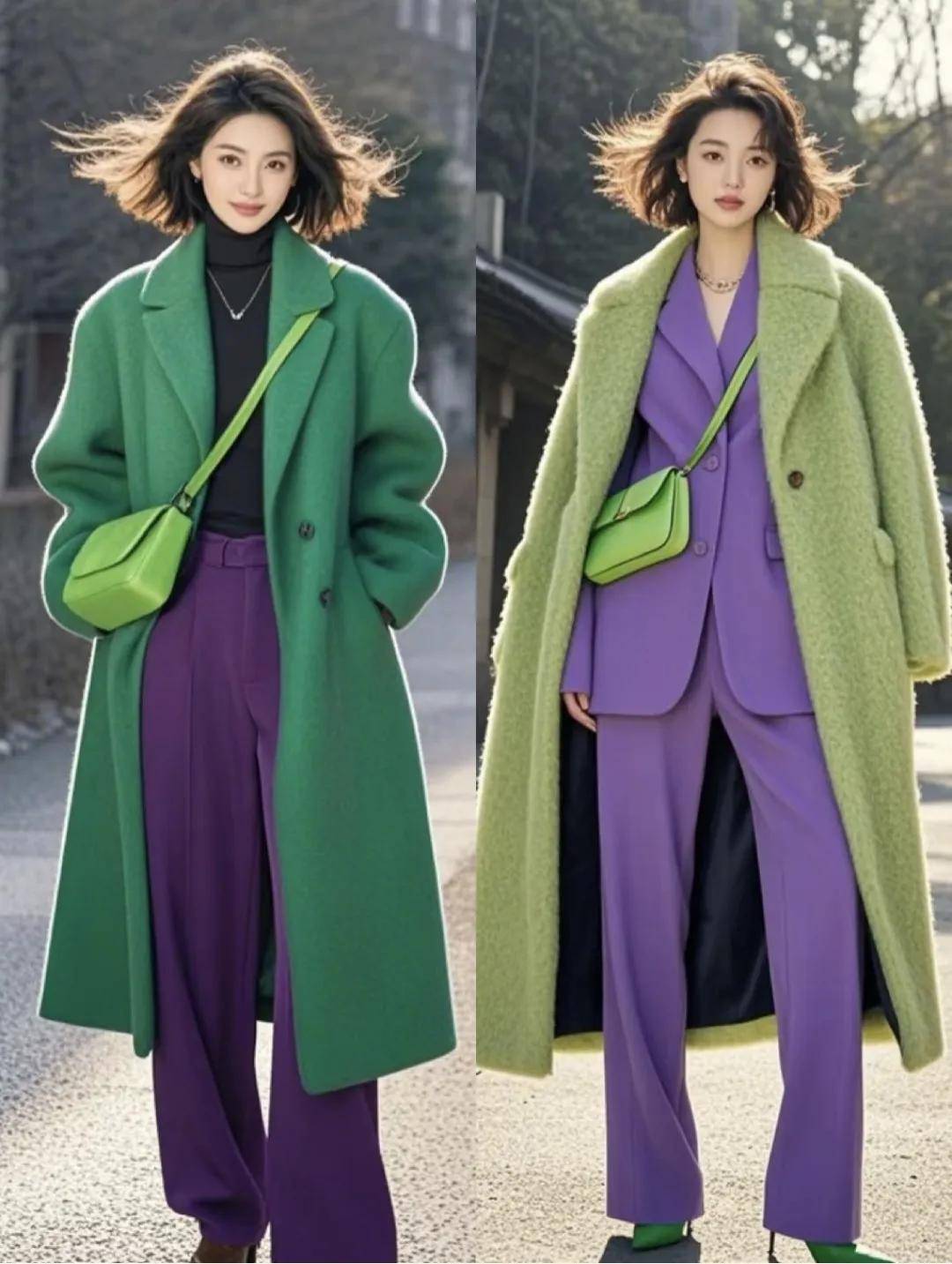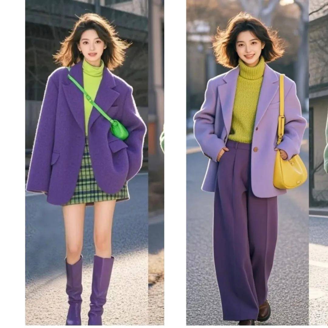 如果你是个非常喜欢时髦感的宝子,你可以尝试在绿色与紫色的穿搭里,加入一些许彩色,比如黄色或者红色点缀。