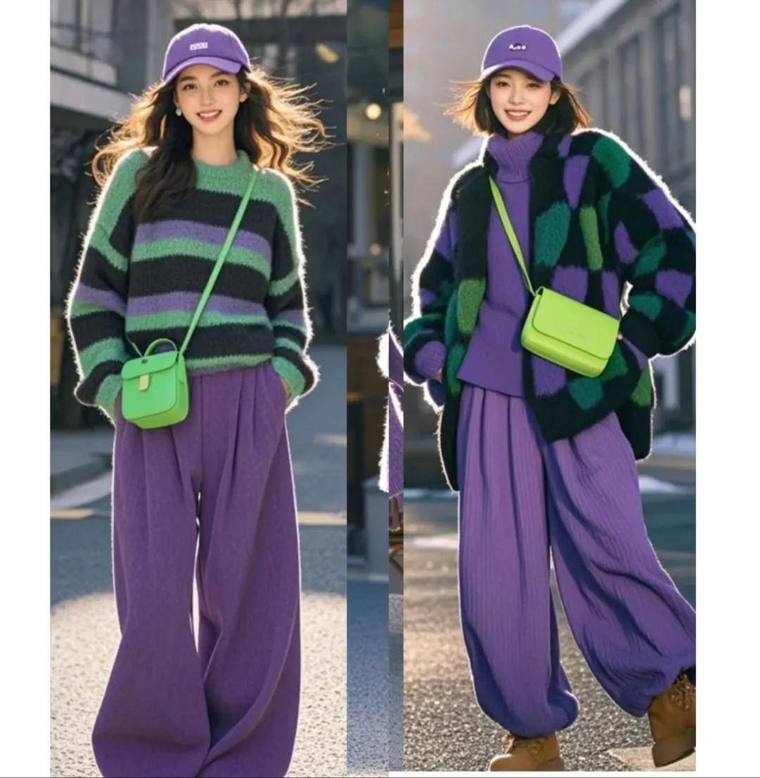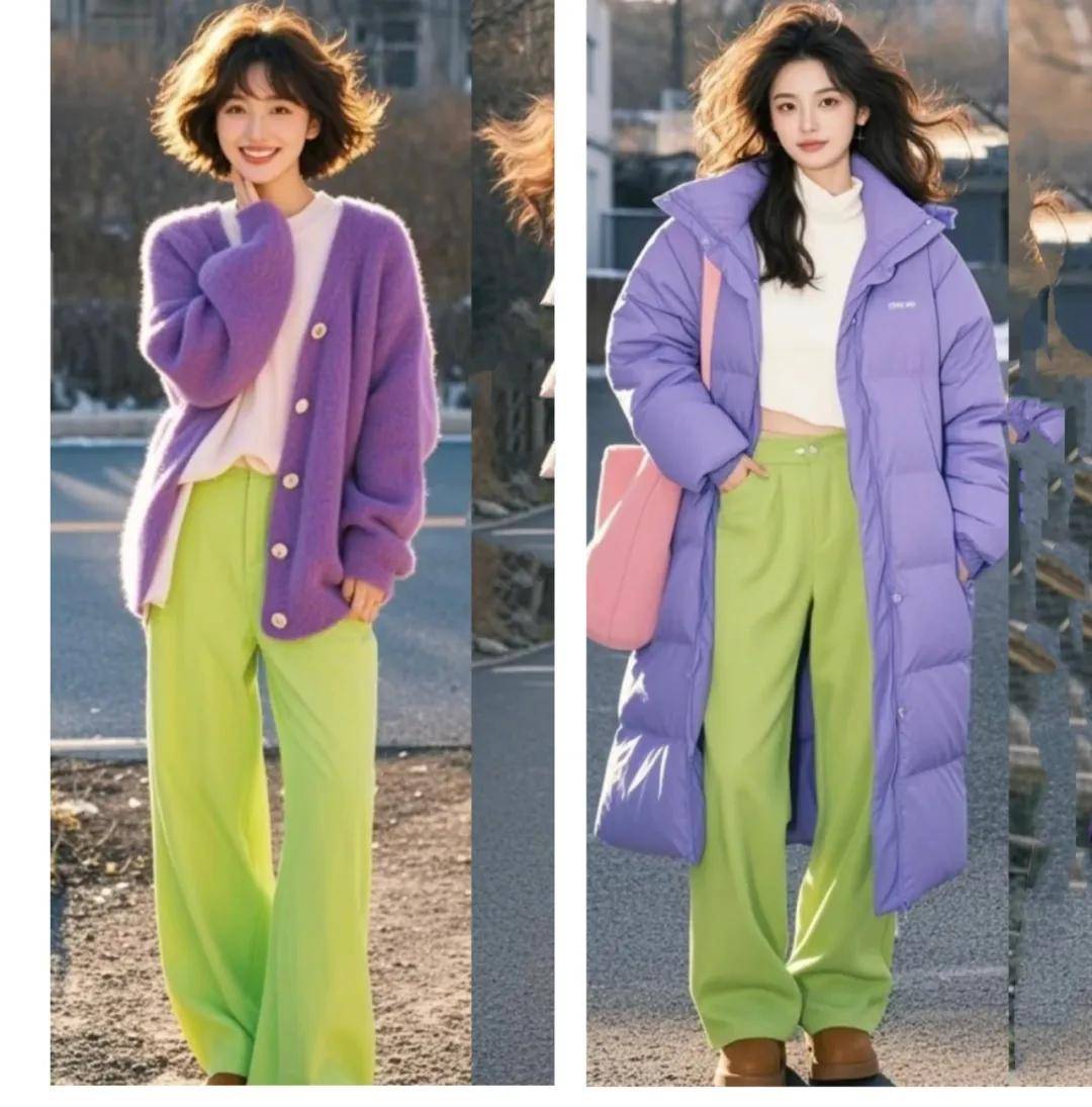 紫色的羽绒服搭配军绿色的灯芯绒阔腿裤,仿佛是春日里紫藤与绿叶的浪漫邂逅,好特别。