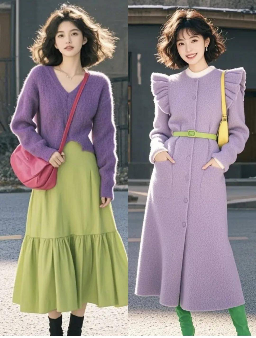不管是以紫色为主色调还是绿色,通过色彩的对比,都能让整体造型更加立体和饱满,整体人看起来就会更时髦。让你显得更加独特和出众。