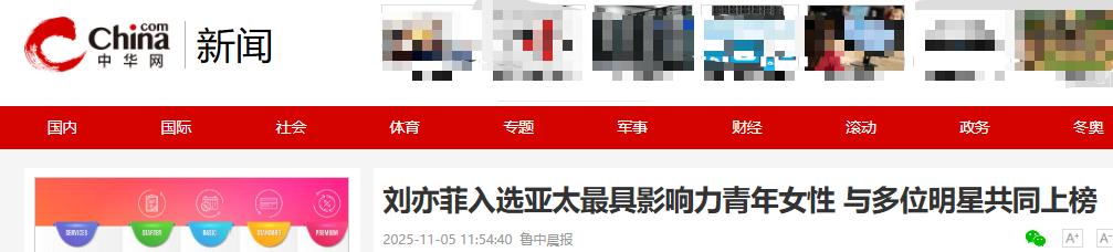 中华网新闻:刘亦菲入选亚太最具影响力青年女性 与多位明星共同上榜