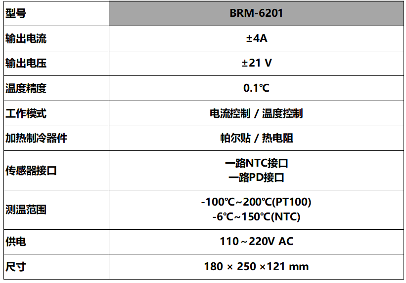 BRM-6201的核心竞争力还体现在其全面的功能配置与强大的适配能力上。产品拥有±21V的宽工作电压范围,可灵活兼容不同规格的供电系统,极大降低了现场部署的局限性。在传感监测方面,除支持1路PT100高精度温度传感器(用于实时反馈帕尔贴核心温度)外,还可外接1路NTC温度传感器,并针对多种NTC型号提供灵活的参数配置功能,既能满足散热器等扩展部件的温度监测需求,又提升了设备的场景适配灵活性。此外,仪器可广泛兼容帕尔贴模块(TEC)与热电阻器件,无需额外适配附件,有效降低了用户的设备升级成本。