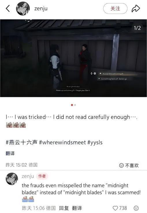 有位德国玩家开服第一天就被假扮成三更天人员的九流门弟子骗进了九流门,国人则留言安慰他说“第一天就体验到了核心玩法”……