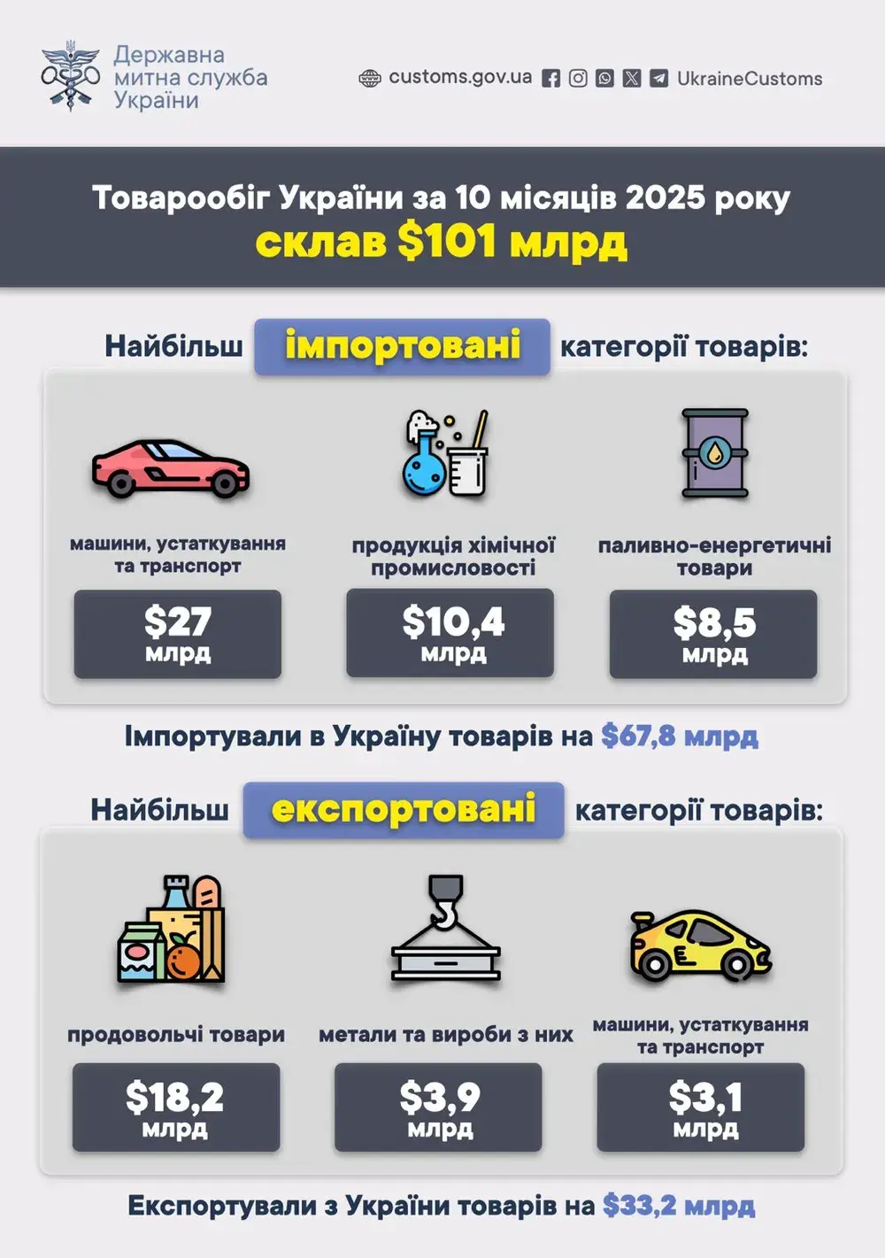 根据乌克兰国家海关局发布的数据,2025年1月至10月,乌克兰进口商品总额为678亿美元,出口总额为332亿美元。与2024年相比,乌克兰主要的商品来源国没有变化:东大——151亿美元,波兰——64亿美元,德国——54亿美元。主要进口商品为机械设备、化工产品以及能源类商品。乌克兰出口最多的国家是波兰——42亿美元、土耳其——22亿美元、德国——20亿美元。去年前三名分别是:波兰、德国、西班牙。