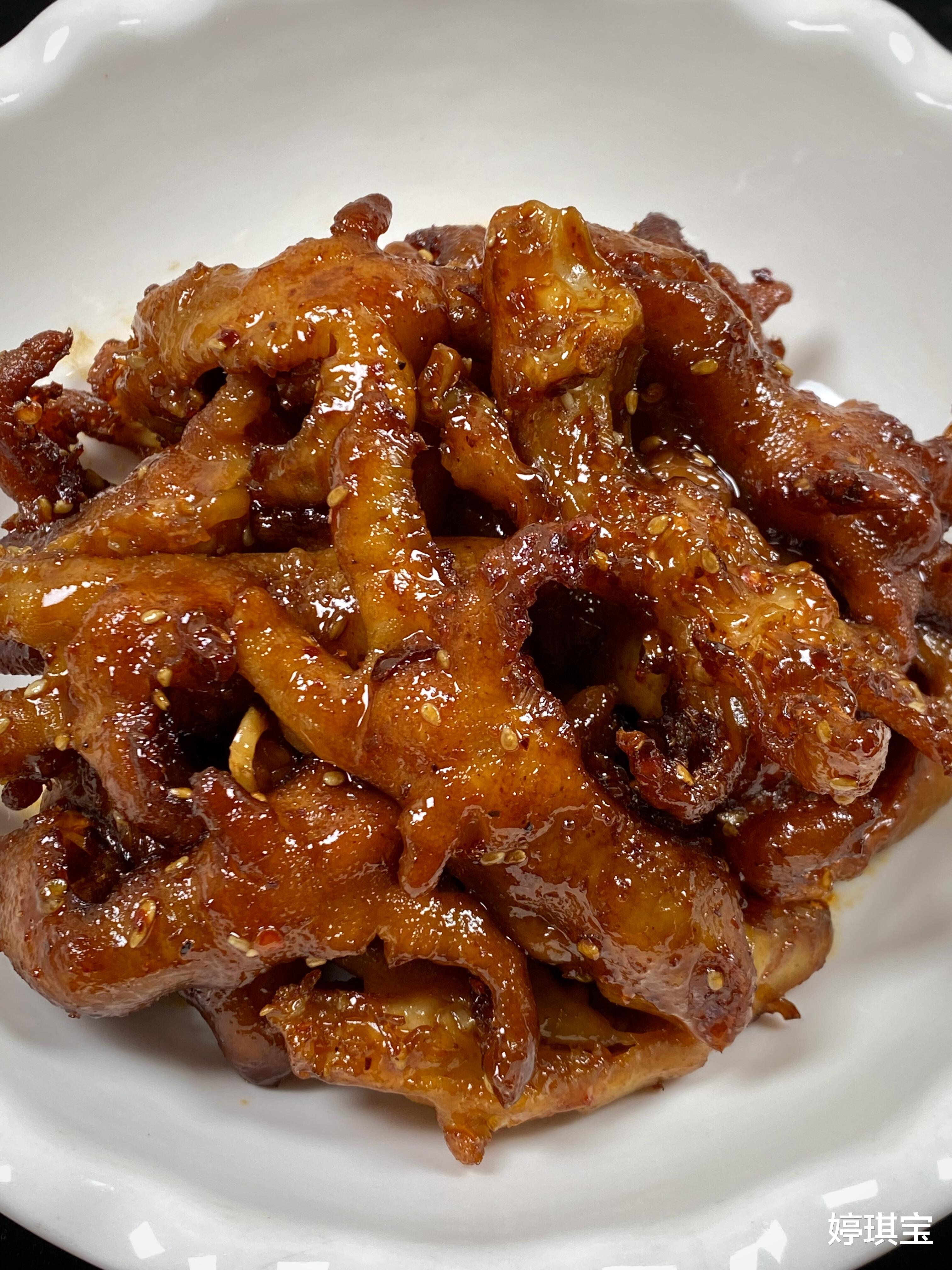 刷上蜂蜜水,撒芝麻,再烤5分钟。看!鸡爪变得红亮诱人,香气扑鼻~