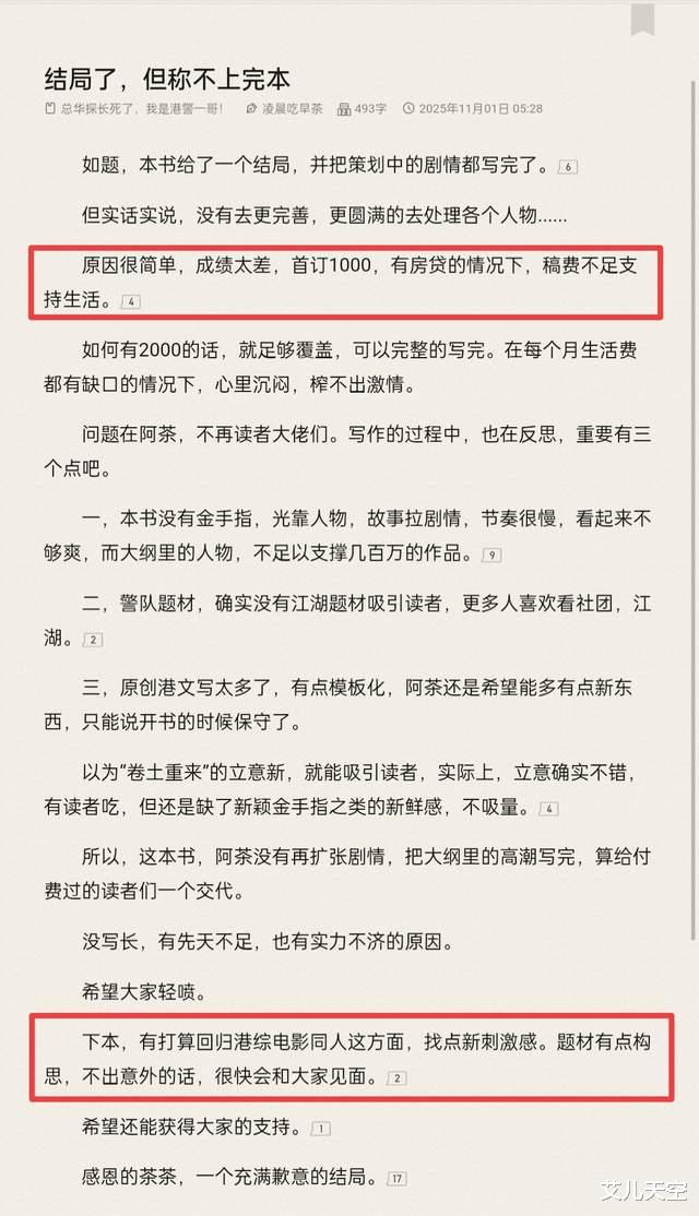 凌晨吃早茶这个账号下,上本的《什么金盆洗手,我又不是龙头大佬》万订成绩一百五十万多字结束的。