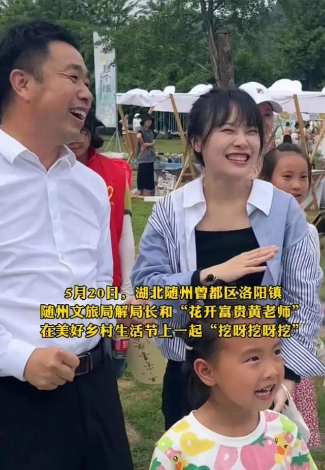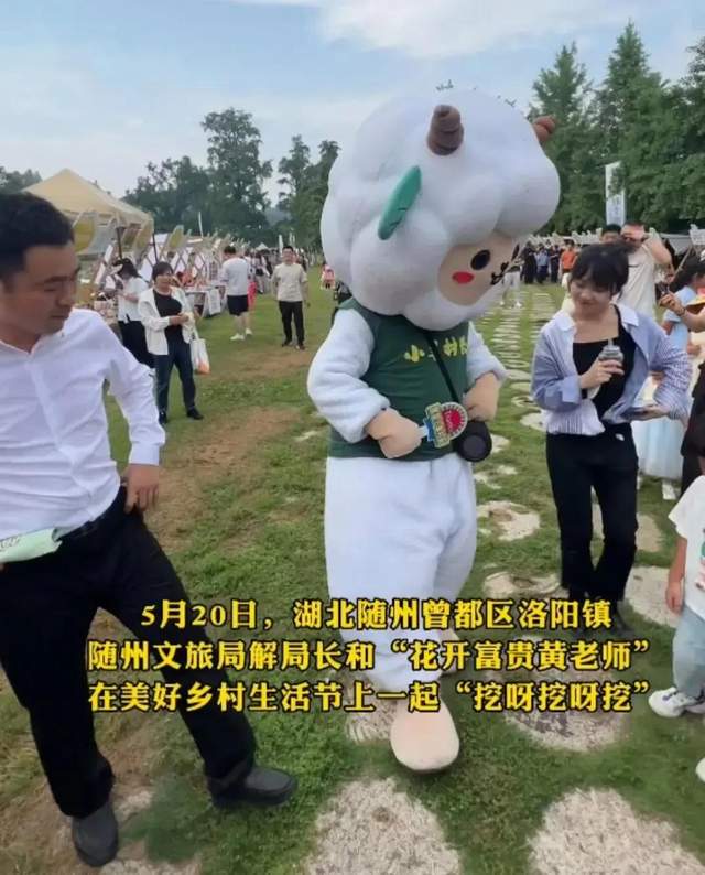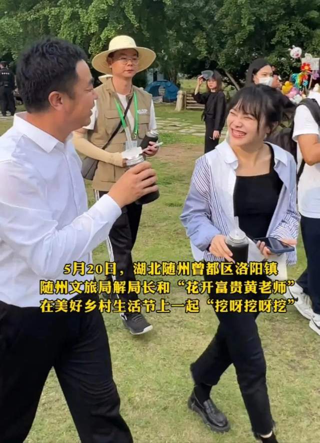 5月20日,因儿歌“挖呀挖”走红的黄老师,出现在湖北随州“美好乡村生活节”进行户外直播,宣传当地旅游。值得一提的是,和黄老师一起出镜的还有随州网红文旅局长解伟,两人合作制作了一段“随州版挖呀挖”,两人配合默契。
