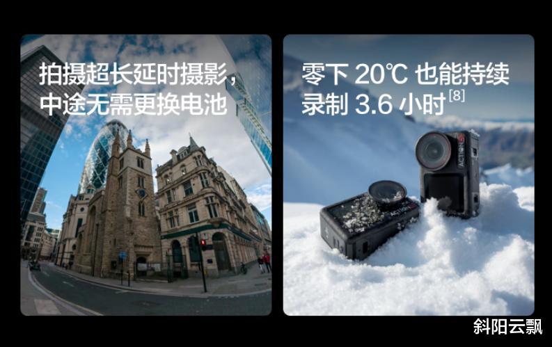 在低温环境下,电池表现同样出色,在零下 20℃也能持续录制 3.6 小时,不用担心相机因低温而罢工。