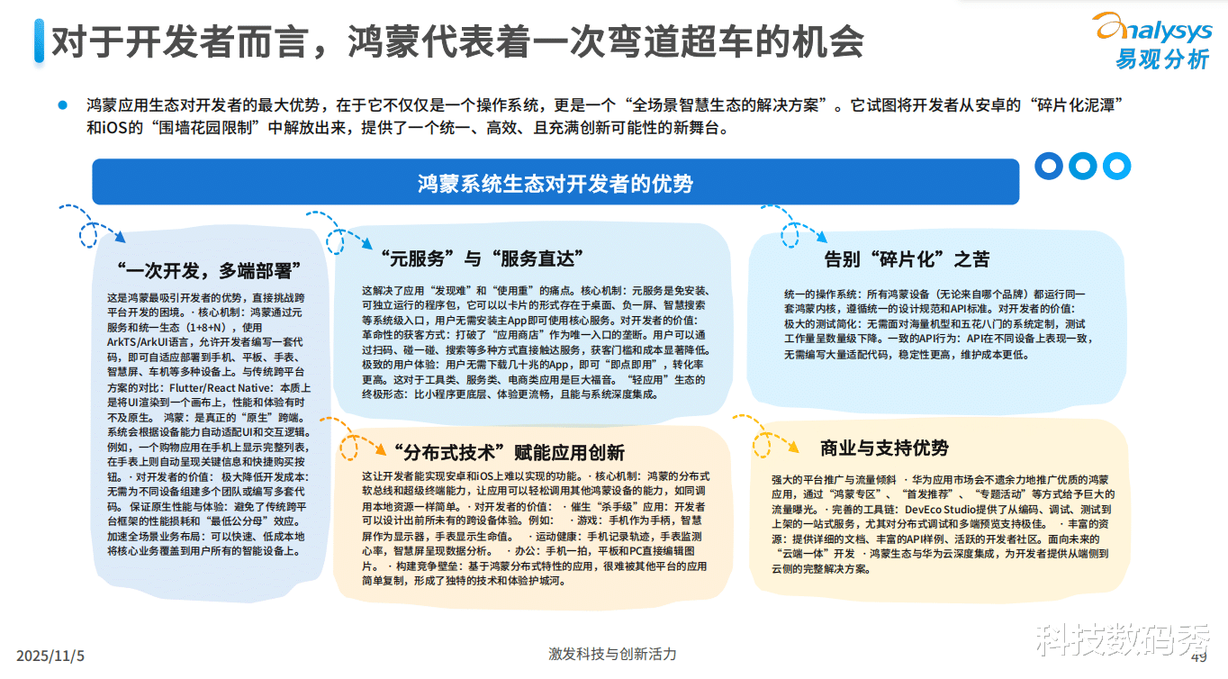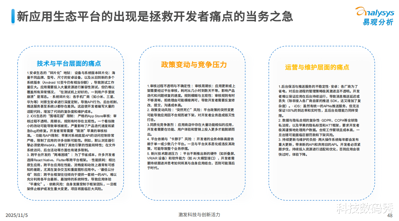 近日,权威分析机构易观分析发布的《鸿蒙应用生态市场发展报告2025》一针见血地指出了如今应用开发者遇到的核心痛点:一边是安卓生态严重的“碎片化地狱”,海量机型和被魔改的系统版本让兼容性测试和后台保活成为噩梦;另一边是iOS的“围墙花园”,严格且主观的审核机制与API限制,束缚了创新的手脚。