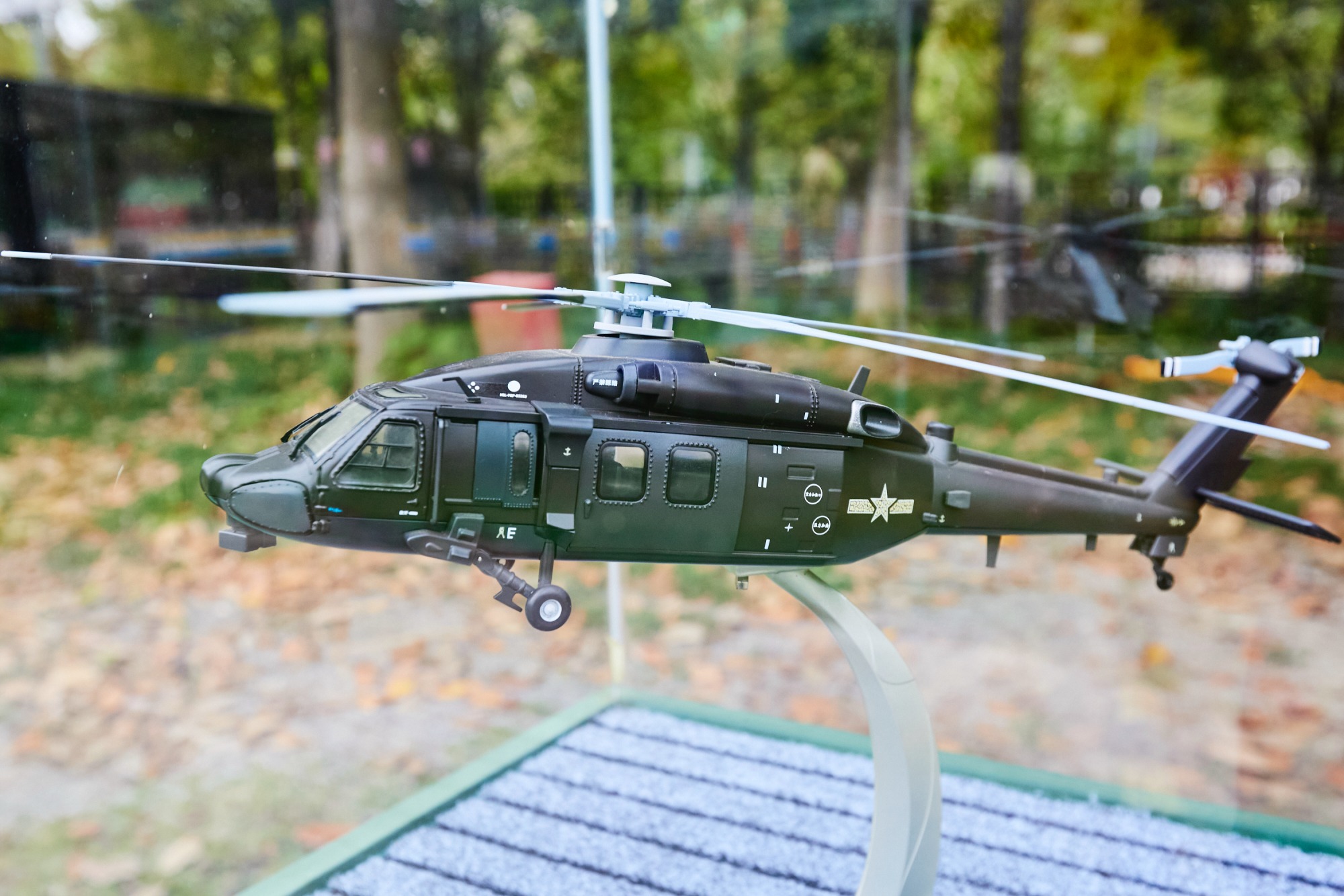 身形庞大的直升机停放在草地上,巨大的旋翼和厚重的机身压迫感十足,舱门打开,可以看到内部构造和各种细节。