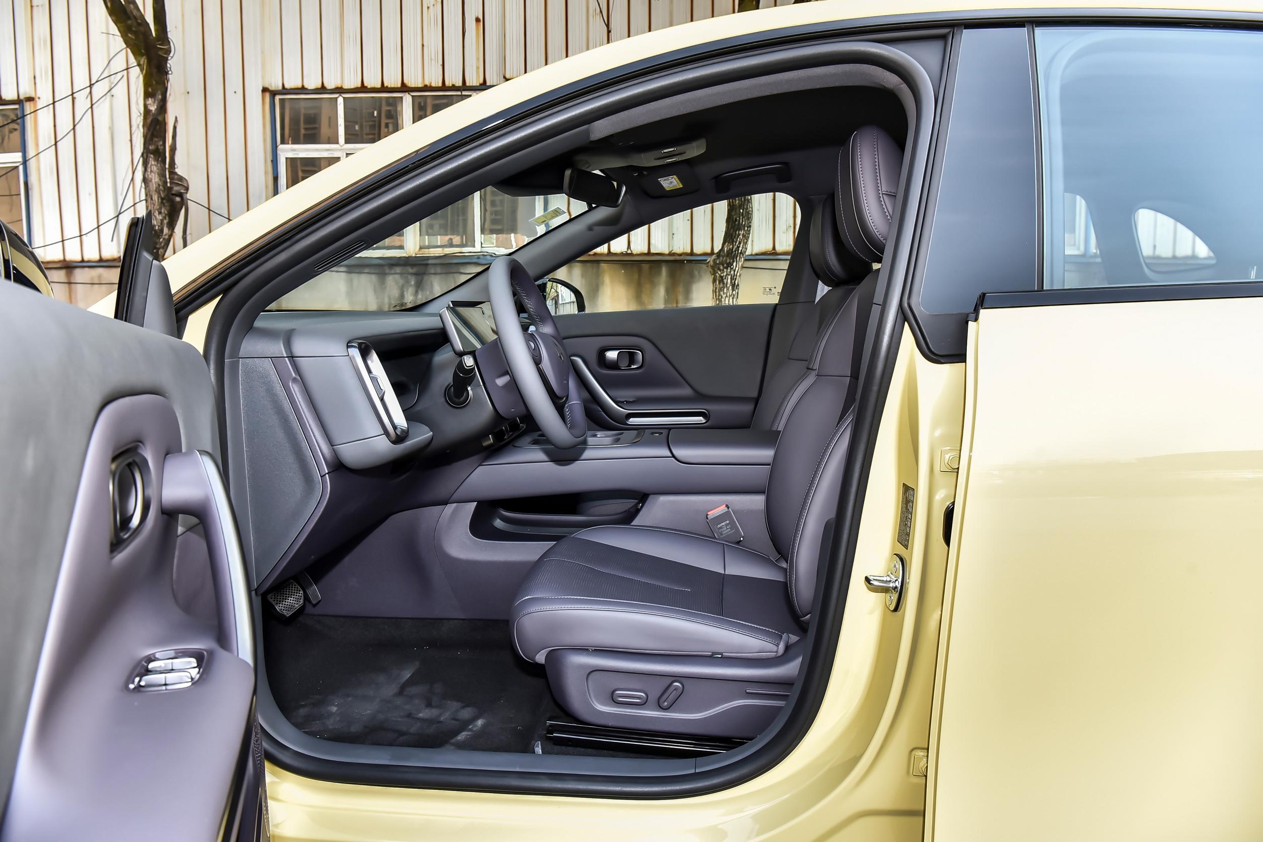 刚走进展厅,那台电掣黄配色的Lafa5确实一眼就抓住了我。在这个价位里,大部分车的设计都偏向保守家用,但这台车完全跳出了那个框框。宽体低趴的姿态加上溜背造型,乍一看真有点像小钢炮。数据不会骗人,车身尺寸4430x1880x1520mm,轴距却做到了2735mm。特别是这个1880mm的车宽,比同级的比亚迪海豚宽了近5厘米,视觉上那种“宽体”的气场确实足。最让我心动的是那个无边框车门,这在10万级纯电车里简直是“稀有物种”。开门时玻璃自动微降1厘米,关门后回升,这种仪式感真的让人上头,同行的朋友都说这配置放在20万级车上都不违和。再加上隐藏式门把手和19英寸的掠翼运动轮毂,前窄后宽的轮胎布局(前225/45 R19、后235/45 R19),运动气息直接拉满。当然,我也注意到了无边框车门带来的一个小细节,后视镜盲区相对明显一点,但好在它标配了360°全景影像,完美弥补了这个视野短板。至于宽体设计在狭窄车位停车是否困难,实际体验下来,5.17米的转弯半径让它比想象中灵活得多,并没有出现“进得去出不来”的尴尬。