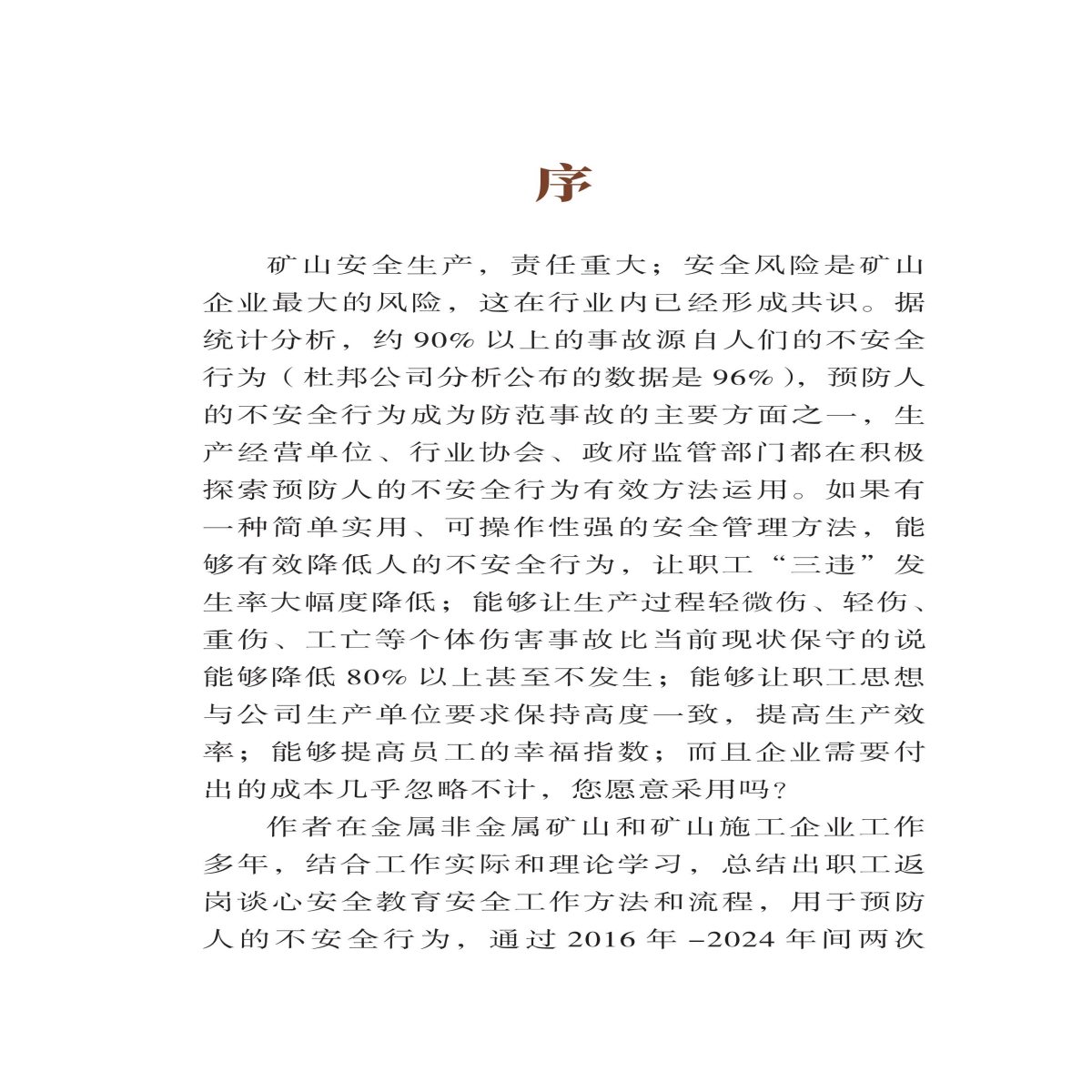 书中详细记录了两次成功应用案例:2016年提升动力车间“零事故”实践,以及2024年采矿车间通过谈心教育遏制轻微伤多发势头的全过程。附件中的台账模板、谈心提纲、考核制度等工具,可直接为企业所用。