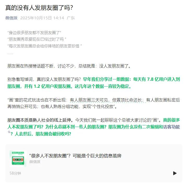 朋友圈被传“已死”?微信公关总监亲自回应:纯属信息茧房!官方数据显示每天仍有1.2亿人在发朋友圈,7.8亿人围观,你的沉默不代表全世界。