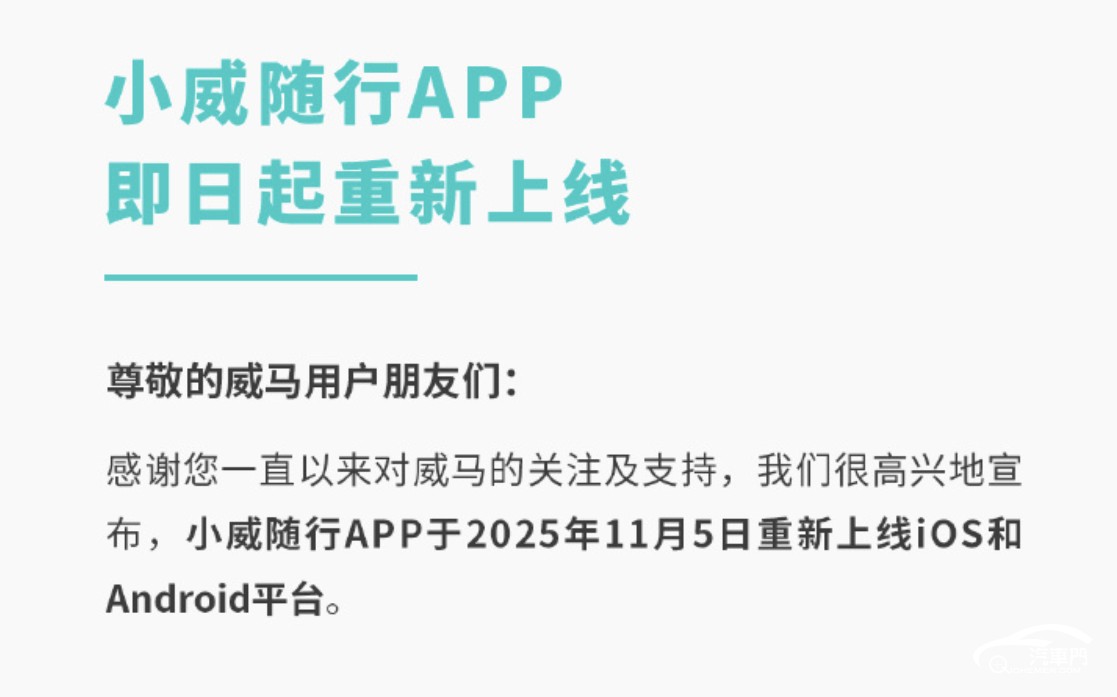 本月初,威马通过官方社媒发布海报并配文“好事将近,敬请期待”。有知情人士称,威马将在月末召开“关于新车的发布会”,好事涉及多方面,包括产品、网络、供应商等,基本上什么都有。不过,这条预告很快被删除,随之而来的是小威随行APP的重新上线通知。在这之前,接盘威马的宝能系企业深圳翔飞发布白皮书,宣称要在2030年实现百万辆产能和1200亿元营收。
