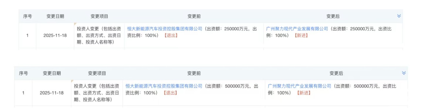 据企查查APP显示,广州国资旗下广州聚力现代产业发展有限公司正式完成变更,成为恒大智能汽车有限公司和恒大新能源汽车有限公司的全资控股股东,原股东恒大新能源汽车投资控股集团完全退出。