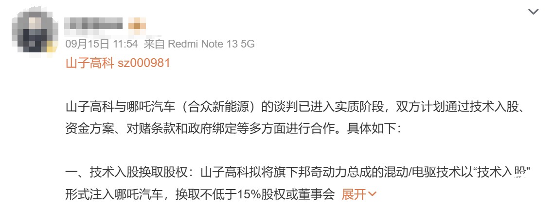 到了9月,有媒体报道称,山子高科正推进与哪吒汽车母公司合众新能源的重组事宜。报道指出,双方的合作将围绕技术入股和供应链整合两大板块展开。另有消息称,待山子高科接管后,哪吒将推出混动+增程双线产品。到了2027年,哪吒将实现整车销量20万辆的目标。