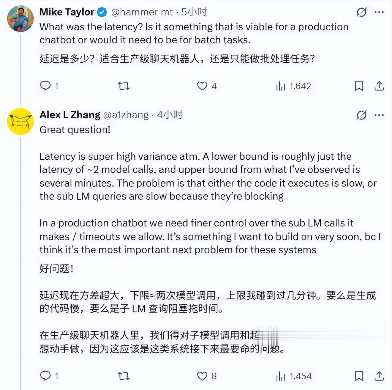 同时,相比于仅依赖 CoT 或 ReAct 风格的代理模型,显式训练以递归式推理为核心机制的 RLM,很可能成为推理时扩展能力领域的下一个里程碑。