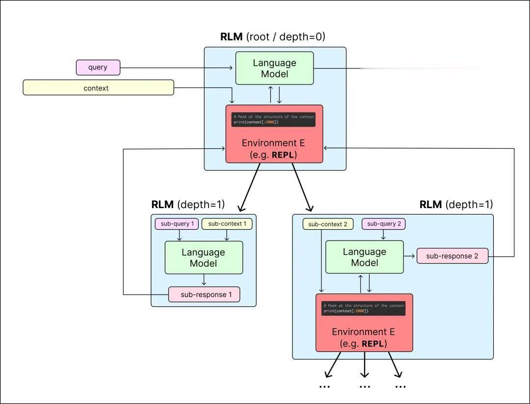 当你向一个 RLM 发起查询时,「根」语言模型(root LM)可以把整个上下文当作可操作的环境来探索和处理。它会通过递归调用(R)LM,将对任意结构或任意长度上下文的处理任务分解并逐级委托,从而实现可扩展的推理能力。