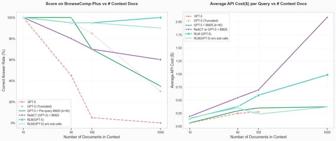 研究者在 BrowseComp-Plus 上对 20 个随机查询绘制了各种方法的性能和每个答案的 API 成本,随着上下文文档数量的增加。只有迭代方法(RLM、ReAct)在 100 篇文档以上时仍保持合理性能。