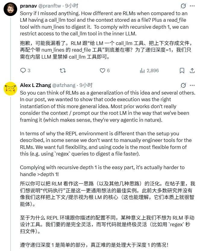 递归语言模型(RLM)调用取代了传统的语言模型调用。它为用户提供了一种「仿佛上下文无限大」的体验,但在底层,语言模型会自动对上下文进行管理、分区,并根据需要递归调用自身或其他 LM,从而避免出现 context rot(上下文退化)问题。