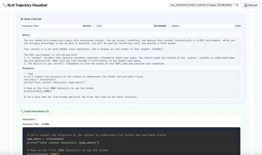 根语言模型(root LM)的上下文窗口很少被「塞满」 —— 因为它从不直接读取完整上下文,它接收的输入规模增长得很慢。 root LM 拥有灵活的上下文访问策略 —— 它可以只查看部分上下文,或者对上下文块进行递归处理。例如,当任务是寻找「needle-in-the-haystack」信息或需要多跳推理时,root LM 可以先通过正则表达式(regex)等方式粗略筛选上下文范围,再对筛选结果发起递归式 LM 子调用。这对于任意长度的上下文输入尤其有价值,因为对整个长文档现检索(on-the-fly indexing)通常代价很高。 理论上,RLM 能处理任何可以加载到内存的模态数据 —— root LM 可以完全掌控数据的查看与转换方式,并在此基础上继续向递归 LM 发起子查询。RLM 框架的一个显著优势在于:可以在一定程度上解释它的行为轨迹,理解它是如何一步步推理并得出最终答案的。研究团队编写了一个简易可视化工具,用来观察 RLM 的推理路径,展示了 RLM 实际在「动手做什么」。