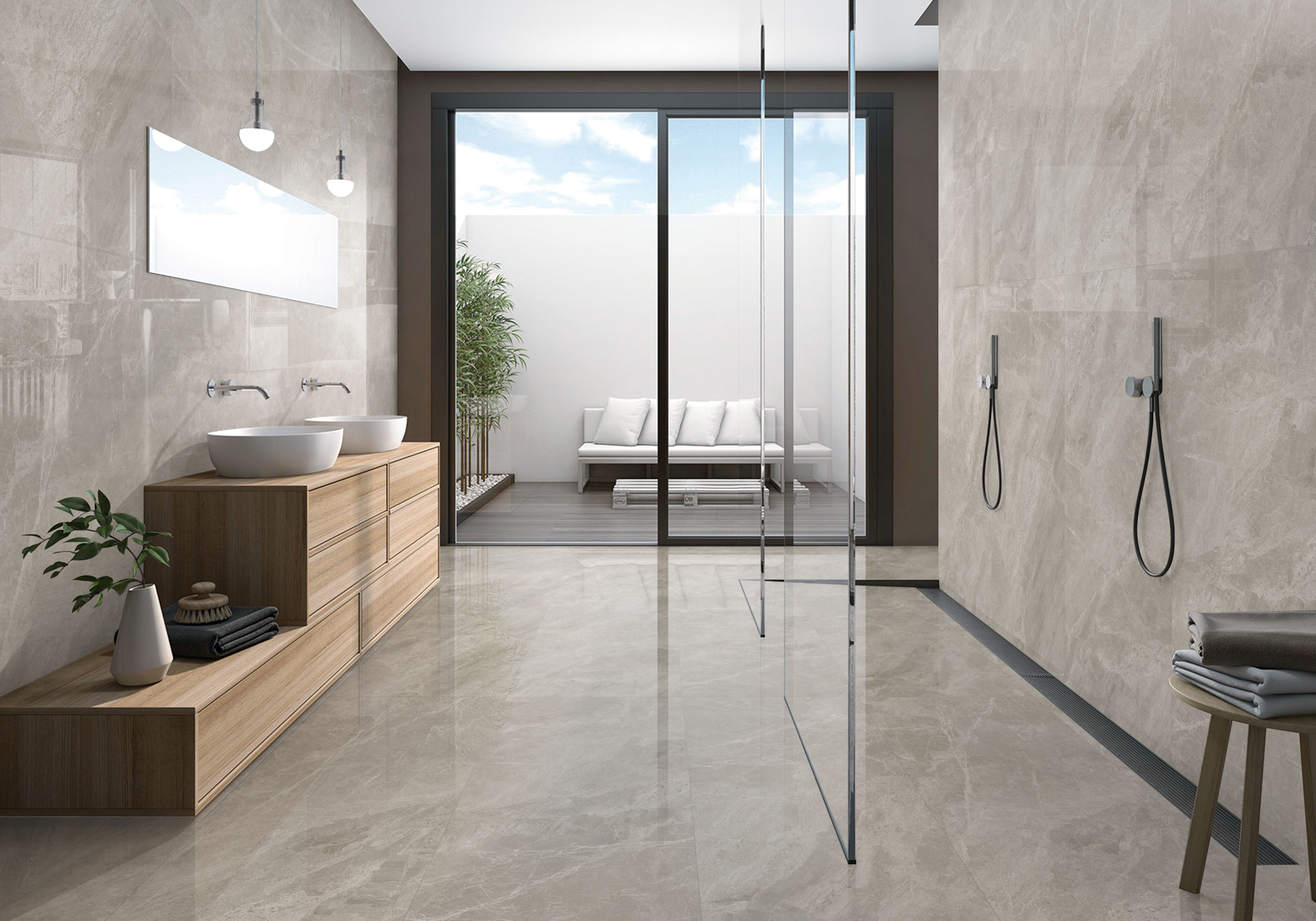墙面和地面选了国际瓷砖品牌罗曼缔克浅米色大理石纹理的瓷砖,质感高级,还很显空间通透。木质柜体温润自然,和冷调的瓷砖、玻璃