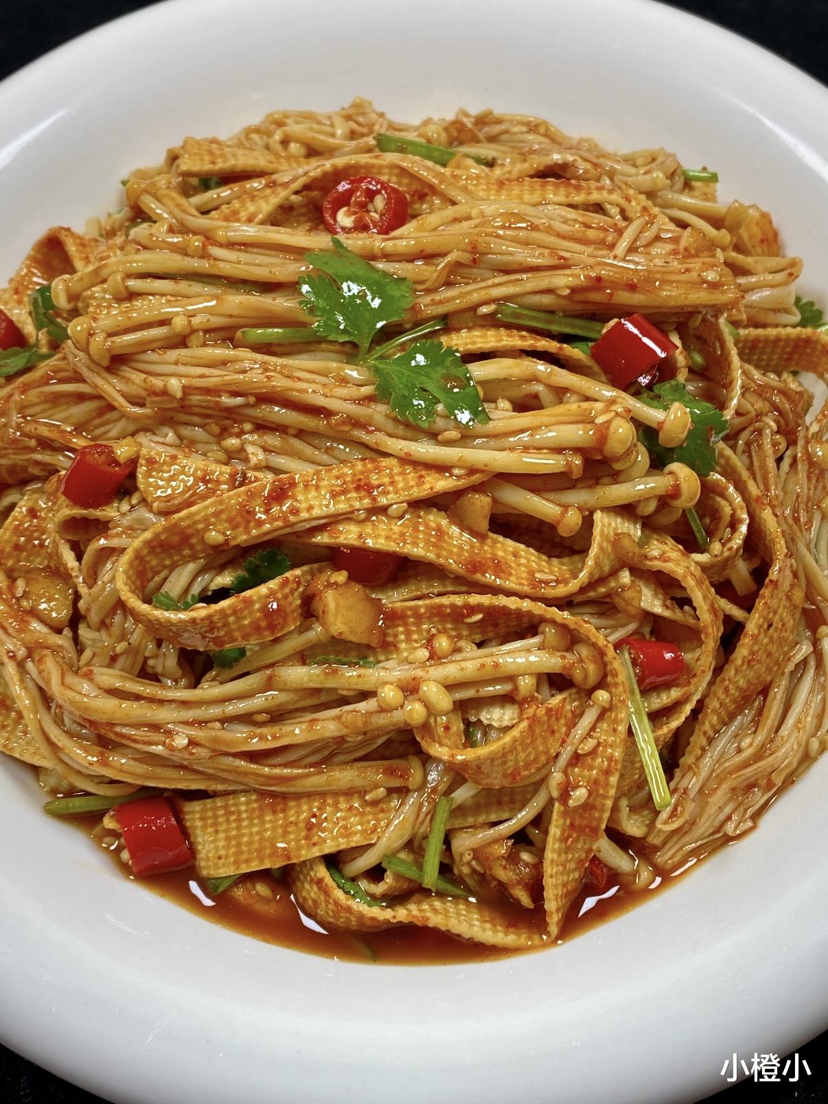 剪掉根部,手撕成小簇,同样沸水入锅15秒——记住只!有!15!秒!捞出冰水一激,金针菇保持“站岗”姿势,咬下去咔嚓脆。