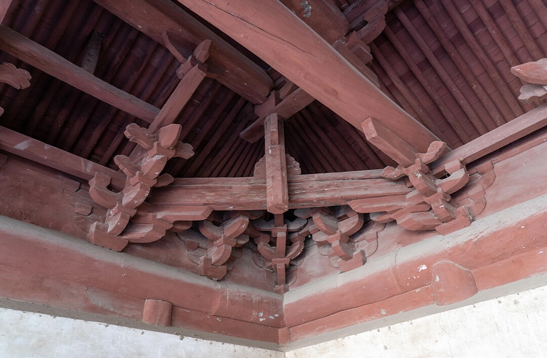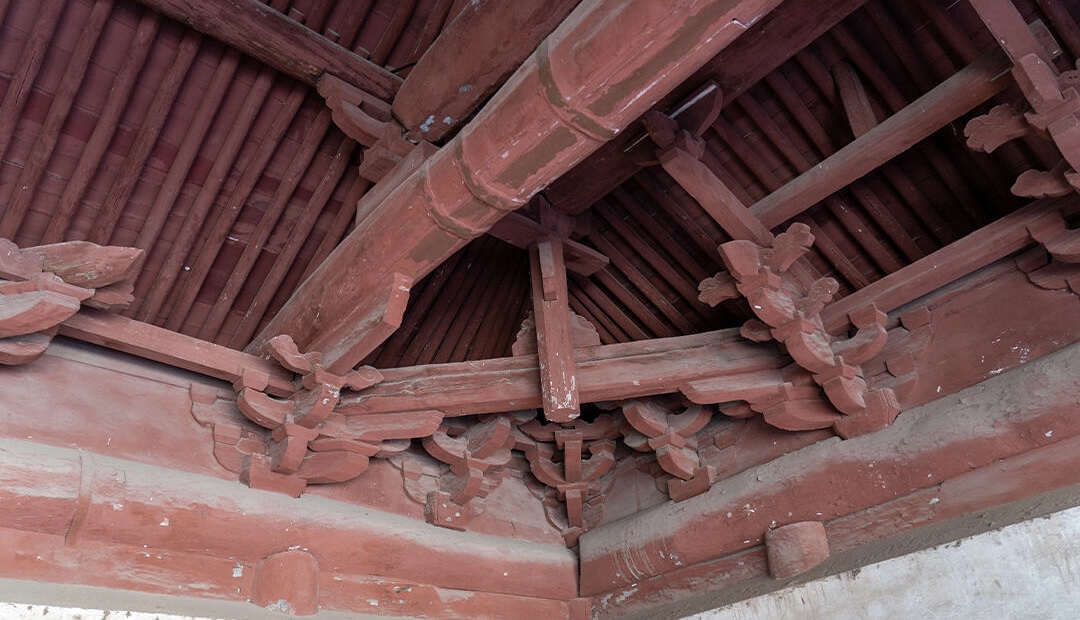 步入戏台内部,四椽栿通檐的梁架结构令人惊叹。两根直径60厘米的金柱直接承托着跨度9.8米的大梁,这种"减柱造"手法在元代戏台中颇为罕见。抬头可见的叉手、托脚等构件,仍保持着原木的天然弧度。2010年落架大修时,工匠在脊槫下方发现了万历年间重修时嵌入的八卦铜镜,镜面氧化形成的铜绿与梁架烟熏痕迹交织,诉说着四百年的香火传承。