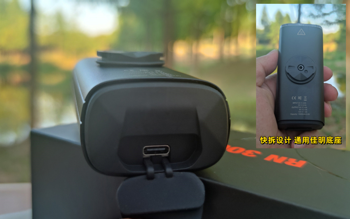 RN3000比我预想中的要小巧一点,包装精致,配件全面。4根不同长度的绑带,搭配底座可试用不同尺寸的车把。车灯采用快拆设计,兼容佳明底座;充电接口采用防水塞设计,车灯支持IP6X级的防水;使用2节21700电池,支持Type-C反向充电,特殊场景可以给手机或者运动相机提供临时供电。