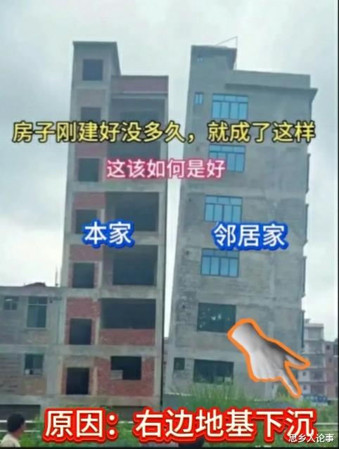 按理说,“本家”的房子晚5年之后才建,“本家”建房的师傅只会担心,把邻居家房子的左边山墙压沉,造成邻居家的房子向左边歪,哪想到,邻居家的房子竟然向右边歪了,这就不是左边地基下沉了,而是邻居家右边地基下沉下,与“本家”建房没有因果关系!由于农村的建房普遍不存在打桩,只是开挖一两米深的地基,这就为地基四边下沉的不均衡埋下了隐患,邻居家分明就是,邻居家是右边地基下沉大于左边,一旦右边再放大下沉的步伐,整个房子有可能向右倒的危险…现在补救的办法就是“扶正”,这是一个基建选项的系统工程,就是邻居房子紧靠右边地脚并排打4口桩,桩洞直径25厘米即可,如果柱基不过10米的话,4口桩洞请专业施工队半天就可干完,同时完成桩洞的混泥土现浇,又是半天,合计一天完工,总花费可能接近1万元…