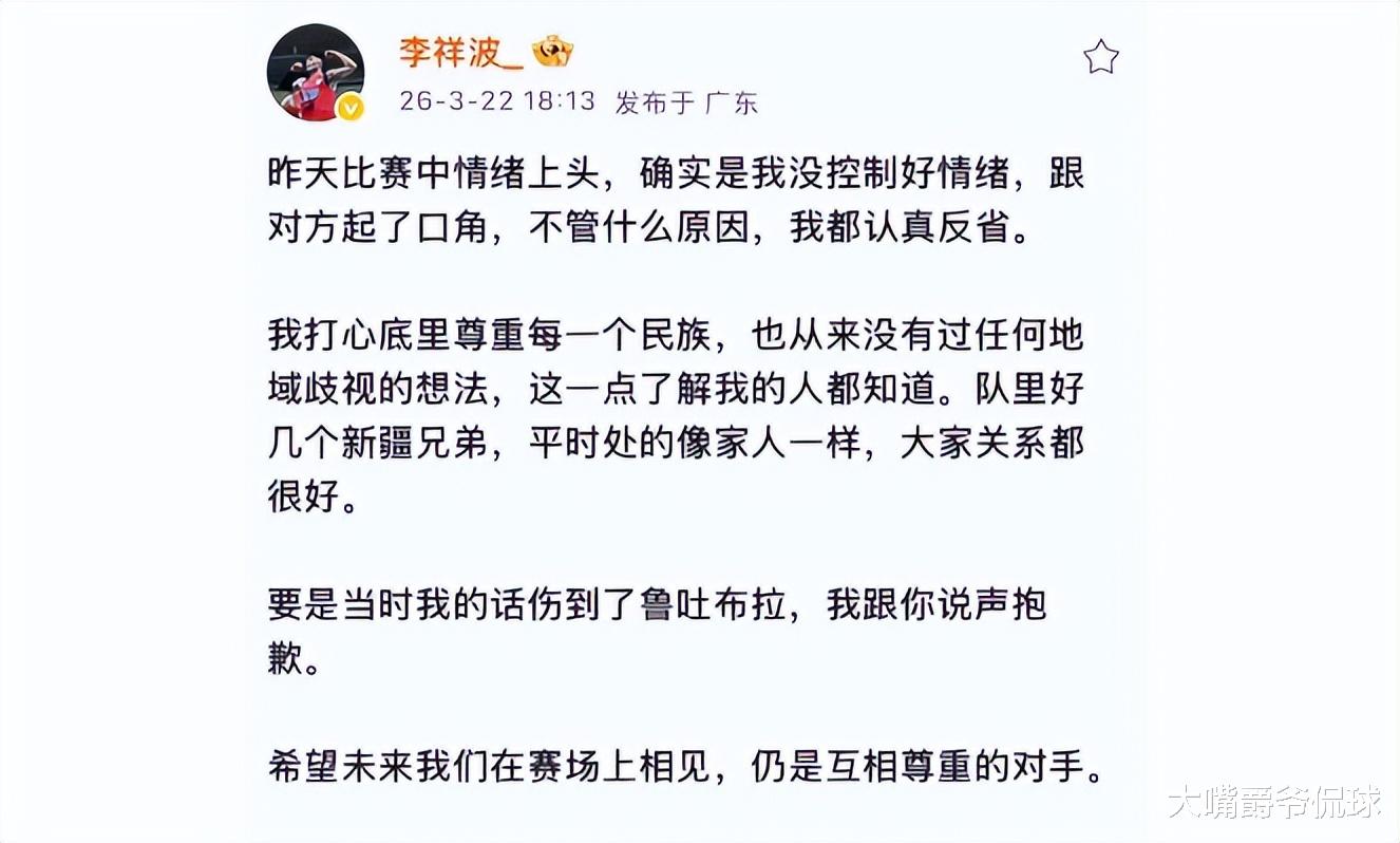 当然,任何地域性的攻击都不值得被提倡,但要对李祥波上纲上线并不妥当,他当时也是因为在比赛中和鲁吐布拉之间对抗太激烈,上头了所致。
