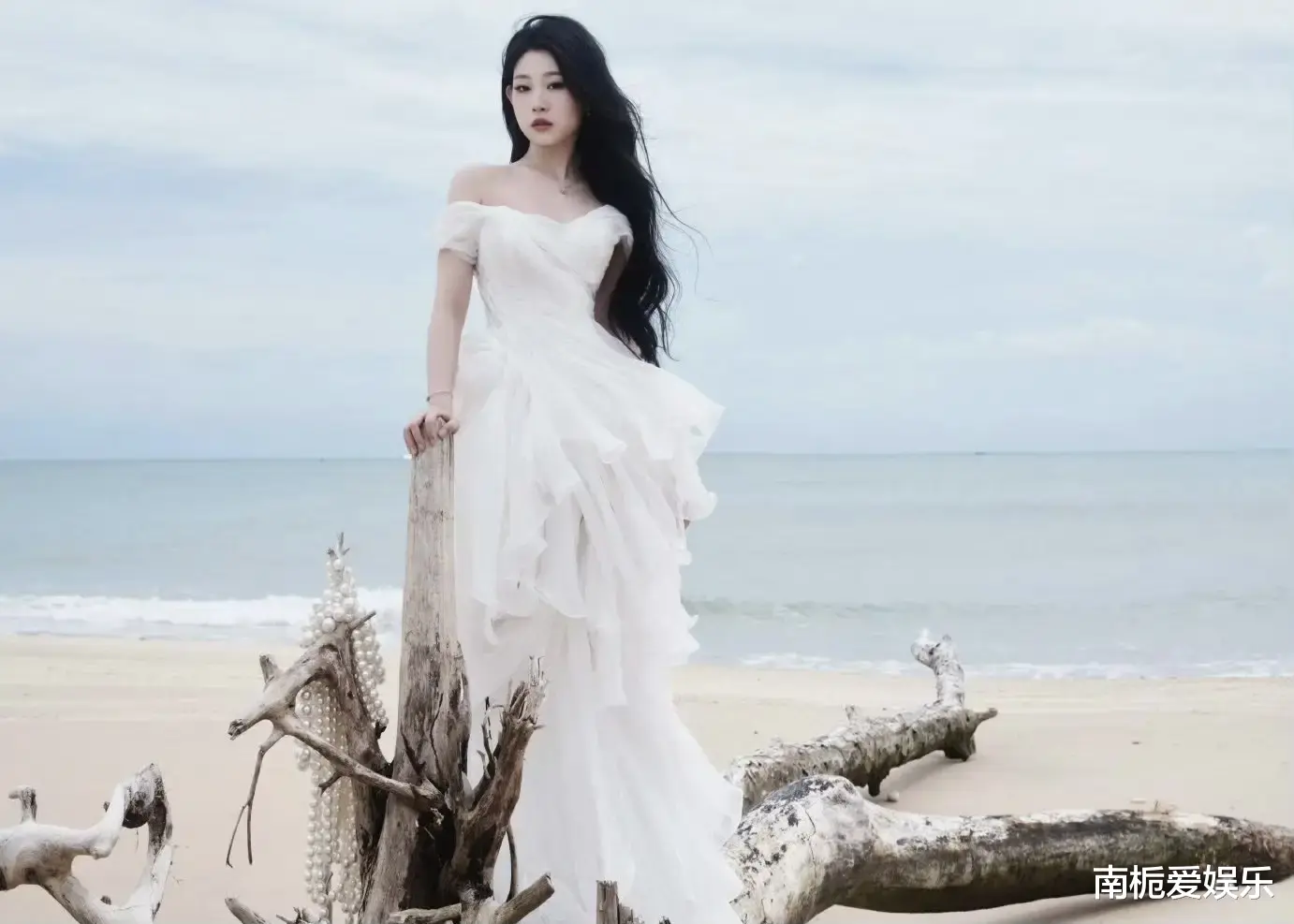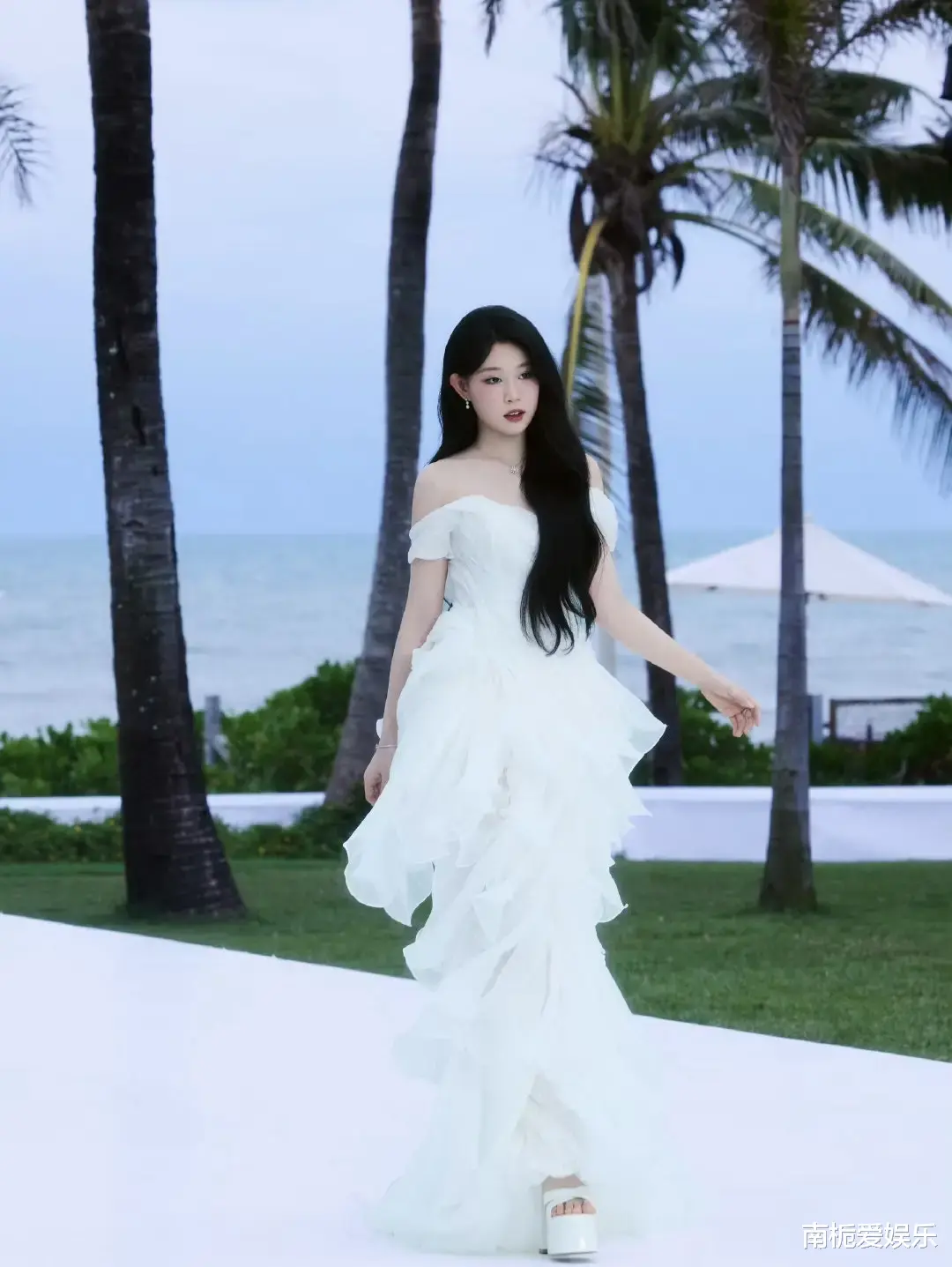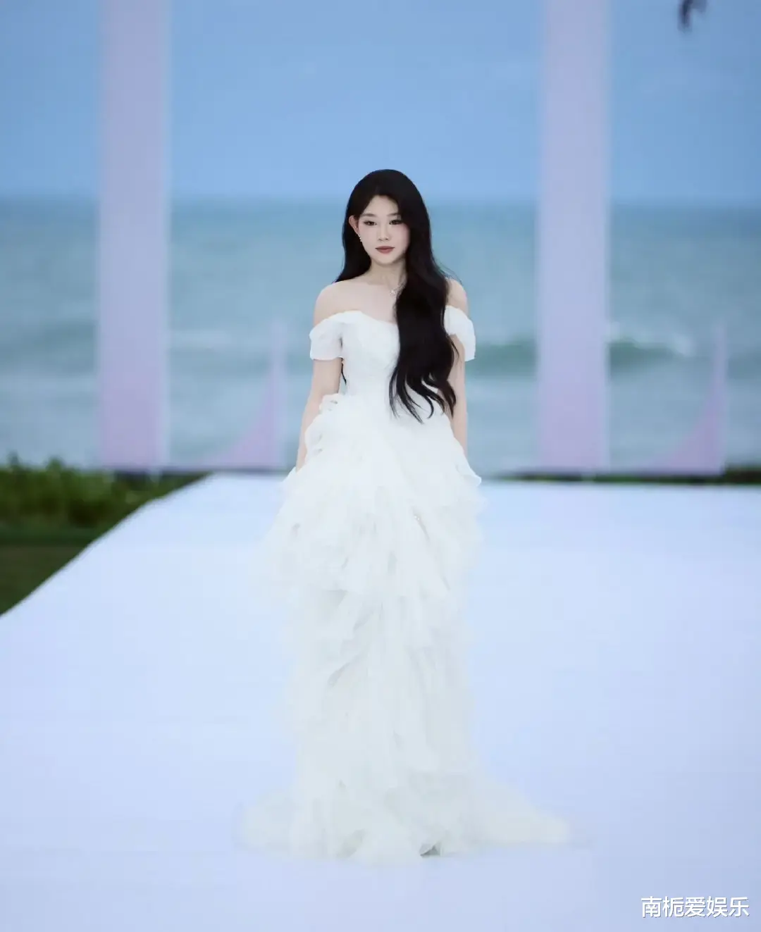 这是她首次独自踏上如此高规格的时尚盛典,身着定制白色露肩纱裙,单侧肩头点缀轻盈羽毛,宛如“独翼天使坠入人间”。蓬松的纱质裙摆随海风轻扬,行走间如羽毛飘落,被媒体亲切称为“行走的奶油小蛋糕”。这一造型不仅契合了海滨主题的浪漫氛围,更以独特的设计语言,诠释出少女独有的纯净与力量。