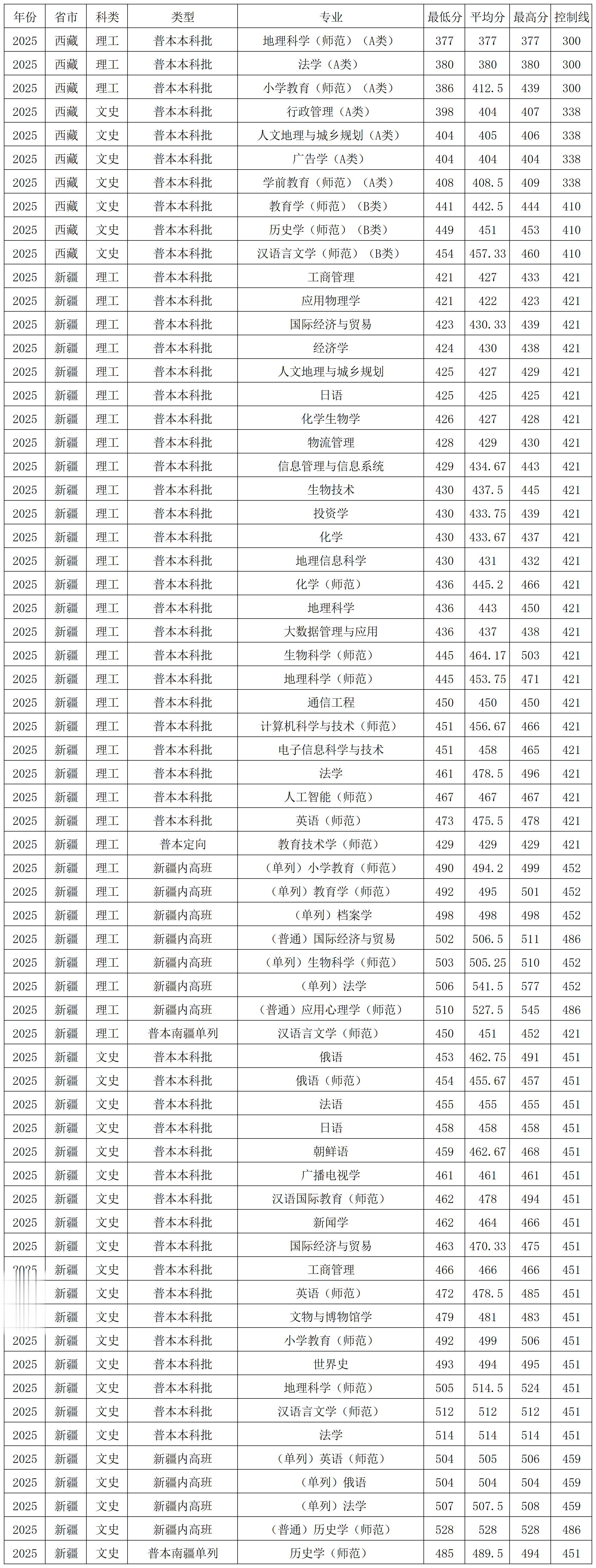 天津师范大学2025年在西藏、新疆各批次各专业录取分数线