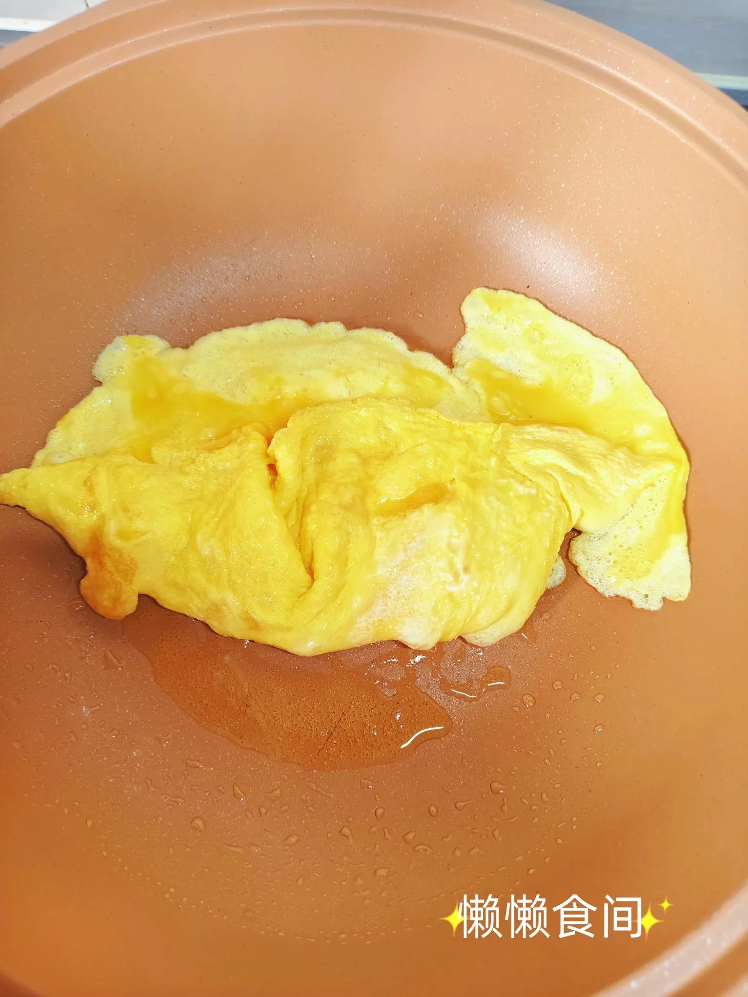 2、锅里倒入食用油,油热加入打散的鸡蛋液,将鸡蛋炒熟捞出备用。