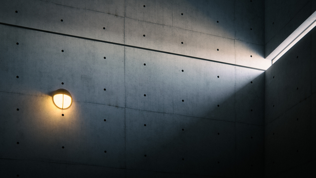混凝土结构彰显了安藤的极简主义美学。然而混凝土的浇筑和成形方式使其在自然光下发光。安藤在东立面放置的十字架让从清晨至白天的光渗透进来,将室内混凝土墙去材质化,从一个黑色体块变为一个发光的盒子。安藤在光之教堂以及其他多个项目中,对光线与混凝土的掌控有一种超现实的效果,在感官上去除了材质,由暗至明,从而延展出空间。