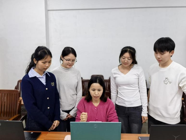 郑婷婷老师则是实训室里的“守夜人”。为攻克3D渲染难题,她与岑璐瑶、陈城同学一同沉浸在光影的世界里,从参数调整到细节推敲,耐心打磨。当屏幕终于呈现出神韵灵动的形象时,窗外已晨光微熹。相视一笑间,所有疲惫化为丰硕的成就感。