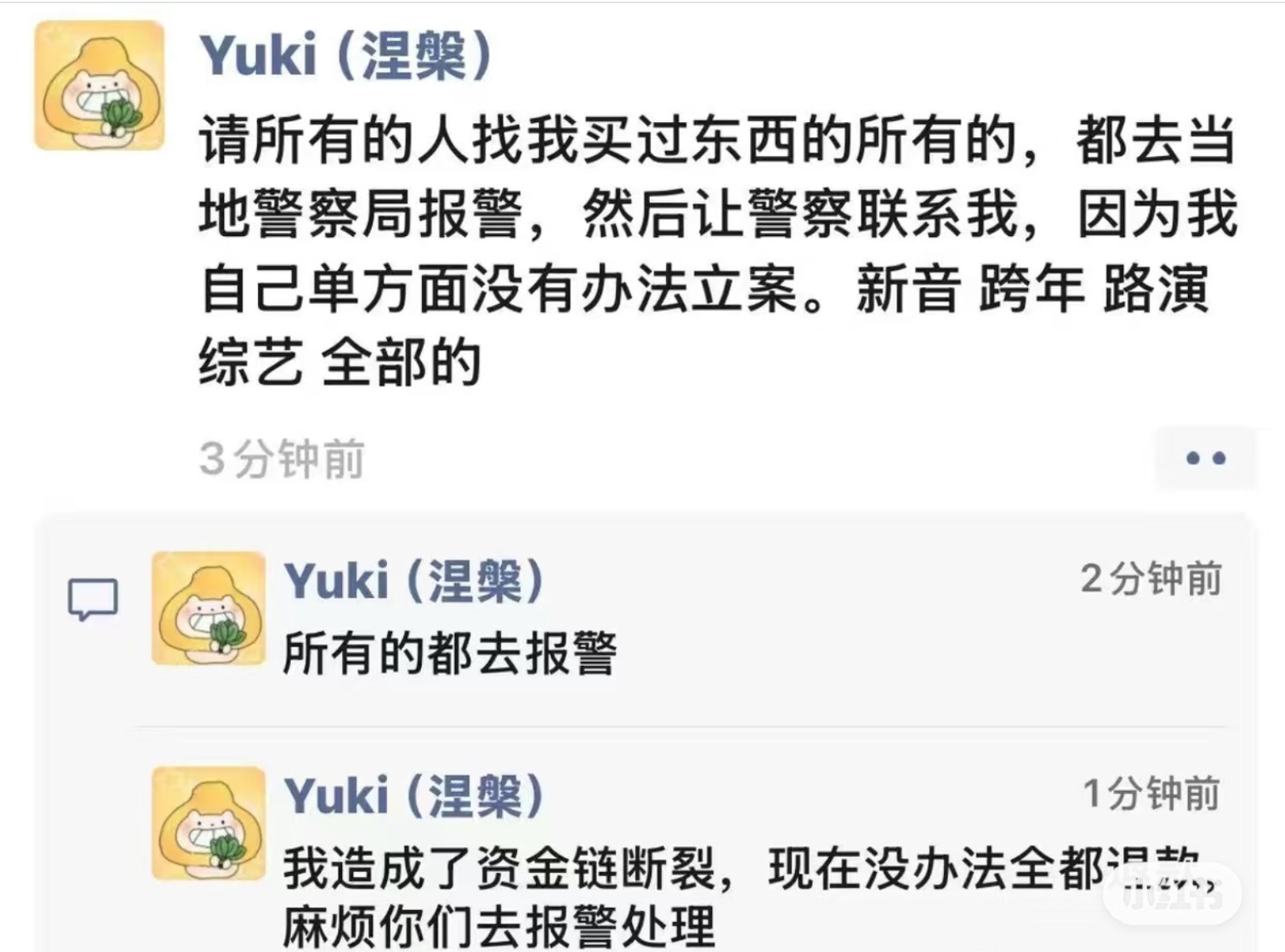 Yuki在朋友圈发布忏悔长文,承认"倾家荡产也补不完窟窿",主动要求受害者集体报警,并称"该坐牢就坐牢"。