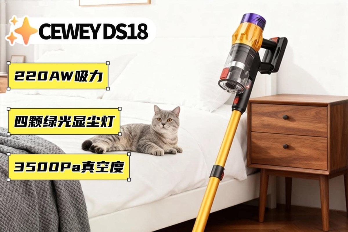 功能配置完善:CEWEY DS18加入了120°广角绿光显尘系统,能精准照亮地面和缝隙中的微尘颗粒,让清洁更直观。多功能刷头采用快拆式结构,地刷、缝隙刷、布艺刷与宠物毛发刷可随时更换。对于有宠家庭来说,宠物吸毛刷能有效处理沙发和地毯中的毛发残留。1.2L的大容量尘杯设计减少了倒尘频率,透明外壳方便随时查看使用情况,操作与清洁都更高效。